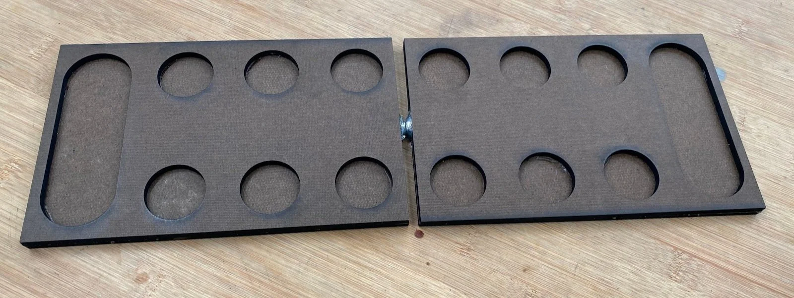 I had originally attempted to create a small and portable mancala board that could easily fold and connect with magnets. Below is a functional prototype made from laser-cut duron and neodymium magnets.